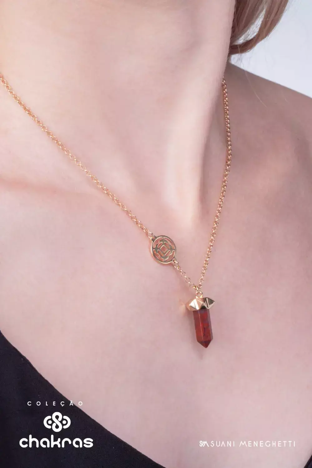Essa peça é inspirada no Chakra Básico ou Base, centro de energia que nos liga com o planeta Terra, o mundo material e o físico. A pedra deste Chakra é a pedra Jaspe Vermelha. Através dela estimulamos nossa intuição nas situações mais difíceis, nos trazendo calma. Além disso, ela traz proteção para combater e bloquear todas as formas de energias negativas. Banhado em Ouro Amarelo ou Ródio Negro, este colar possui a mandala e a pedra correspondente ao Chakra Base.
