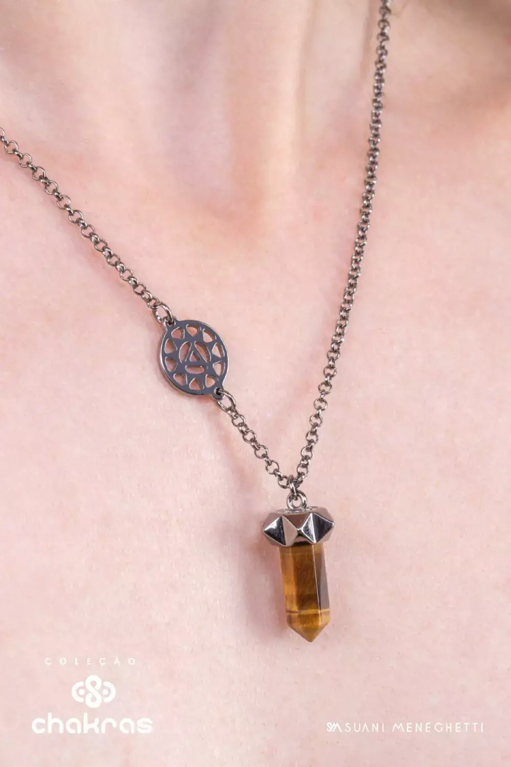 Essa peça é inspirada no Chakra Plexo Solar que é o centro de energia que nos conecta com o nosso poder pessoal, nosso brilho! É dele também que vem a nossa força de vontade e autodisciplina. A pedra deste Chakra é a pedra Olho de Tigre. Através dela podemos ativar de forma intensa o nosso intelecto, tendo mais clareza mental. É a pedra de prosperidade, pois vibra atraindo ganhos financeiros, favorece a boa sorte e ajuda a abrir os caminhos para o seu portador. Banhado em Ouro Amarelo ou Ródio Negro, este colar possui a mandala e a pedra correspondente ao Chakra Plexo Solar.